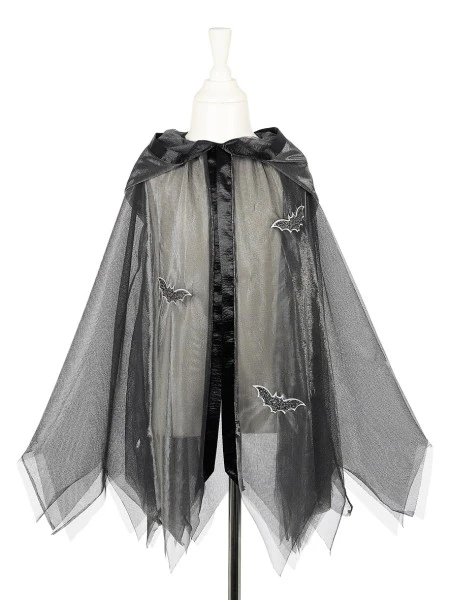 Der schaurig-schöne Umhang Mathilde von Souza hat Fledermausapplikationen und eine Kapuze. Durchsichtig und mit Zipfeln setzt er noch ein I-Tüpfelchen auf das Hexen- oder Vampirkostüm.