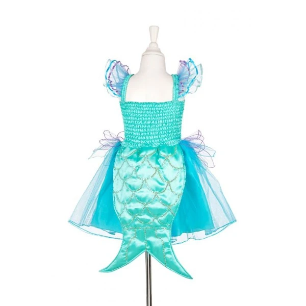 Oberteil und Schwanz des Kleides sind aus schimmernden Stoff, der natürlich an Fischschuppen und Nixen erinnert, an den Trägern und im Rock findet sich viel fluffiger Tüll. Ein tolles Kinderkleid für Karneval, Fasching und die Verkleidungskiste.