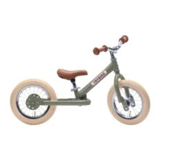 Dieses Trybike in schickem vintage green lässt sich sowohl als Dreirad als auch als Laufrad mit zwei Rädern verwenden. Ein Umbau macht es möglich, das Umbaukit ist im Set enthalten. Mit diesem coolen Rad hat das Kind also von ca. 1 Jahre bis ca. 6 Jahren richtig lange Spaß! Es gibt hier keine Pedale, das Kind stößt sich mit den Füßen auf dem Boden ab. Die sichere Dreirad-Variante ist also so ähnlich wie ein Rutscheauto, die Zweirad-Variante ist ist schon ein schnittiges Laufrad, mit dem Balance und Geschwindigkeit erlernt werden. Der Übergang zum richtigen Fahrrad fällt „Laufrad-Kindern“ in der Regel sehr leicht, das die nötige Balance schon erlernt wurde. • Dreirad mit 3 Luftreifen mit Option auf Umbau zum Zweirad • Reifengröße: 24,5 cm Durchmesser / 12 inch