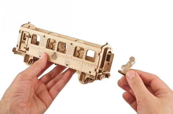 Die Lokomotive sorgt mit ihrem Metallfeder-Motor und den Getrieben zur Übertragung der Kraft auf die Räder für den Antrieb des Modells. Sie wird mit einem Spezialschlüssel aufgezogen. Die attraktive Lokomotive kann alleine fahren oder man kann zwei Waggons ankoppeln — einen Kohlentender und einen Personenwagen. Der Kohlentender ist leer. Der Personenwagen umfasst drei Abteile, drei Türen, die sich öffnen lassen und ein abnehmbares Dach.