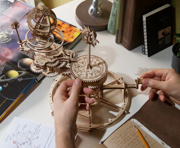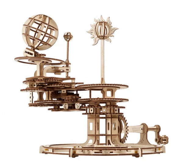 Der Modellbausatz Tellurion von Ugears besteht aus 249 Teilen. Das Tellurion veranschaulicht die Bewegungen der Himmelskörper Erde, Mond und Sonne. Das Modell ist so konzipiert, dass eine volle Kurbelbewegung einem Tag entspricht. Die Zahnradmechanik ist einer Entwicklung des Mathematikers Christiaan Huygens nachempfunden.