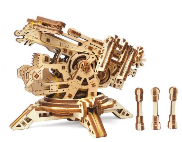 Der Ugears Modellbausatz Turmballista besteht aus einem Turm und einer Balliste. Der Bausatz besteht aus 292 Teilen und richtet sich an fortgeschrittene Ugears Modellbauer, die für den Zusammenbau ca. 6 Stunden benötigen.