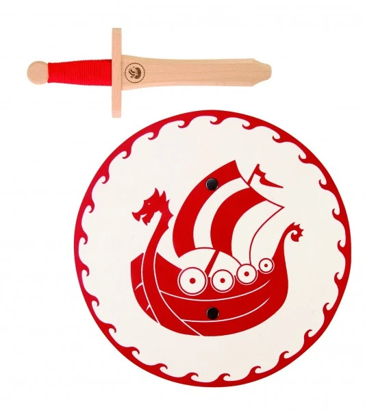 Das Wikingerset „Snorre“ von VAH ist aus hochwertigem Holz angefertigt. Das runde Schild hat ein rotes Wikingerschiff-Motiv auf hellem Grund und roter Wellen-Verzierung um den Rand. Natürlich hat es einen bequemen Handgriff, dieser ist aus Kunstleder genietet. Das Schwert ist am Griff von roten Baumwollflechtleinen umwickelt. Ein besonderes Detail ist das eingravierte Schiff auf dem Schwert, passend zum Schild! Ein tolles Set für alle kleinen Wikingermädchen und Wikingerjungen.