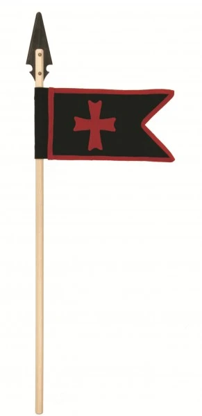 Mit dieser Lanze sind die jungen Ritter bereit für ein mittelalterliches Turnier um Ruhm und Ehre. Die schwarze Fahne mit einem roten Kreuz ist aus strapazierbarer Baumwollte und zeigt die Zugehörigkeit zu den Tempelrittern. Die Lanze ist handgearbeitet und ein Schmuckstück für junge Ritter, die diese mit Stolz auf mittelalterlichen Festen oder auch im Kinderzimmer präsentieren können. Passend dazu der Tempelritter-Wappenrock und das Tempelritterschild.