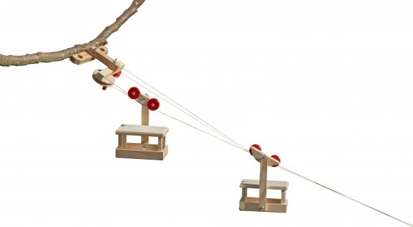 Nun gibt es mit der Pendel-Seilbahn einen schönen großen Baukasten, der den Pendelverkehr zweier Seilbahnen ermöglicht. Das ist natürlich großartig, denn damit können kleine Dinge z.B. aus dem Garten zum Kinderzimmer oder von Balkon zu Balkon transportiert werden. Eine Kirsche gefällig? Kein Problem! Wird die Bergstation an einem Baumast befestigt, können kleine Puppen auf eine Gipfelfahrt geschickt werden. Natürlich kann der Pendelverkehr auch im Haus bzw. im Kinderzimmer stattfinden.