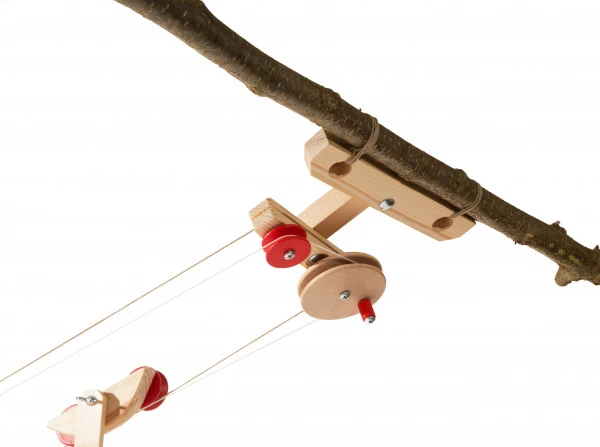Die STATION von Walter Kraul wird am höchsten Punkt montiert und ermöglicht den Pendelverkehr mit zwei Wagen. Sie hält die beiden Tragseile im richtigen Abstand und lenkt das Zugseil um. Wird an dem Rad gedreht, so kommt die eine Gondel herauf, während die andere abwärts fährt. Man kann auch den oberen Wagen beladen, bis er mit seinem Gewicht die andere Gondel von alleine hochzieht.