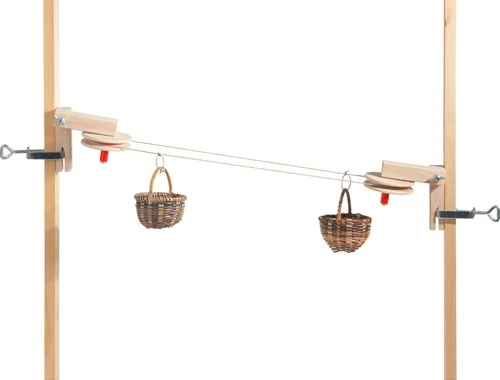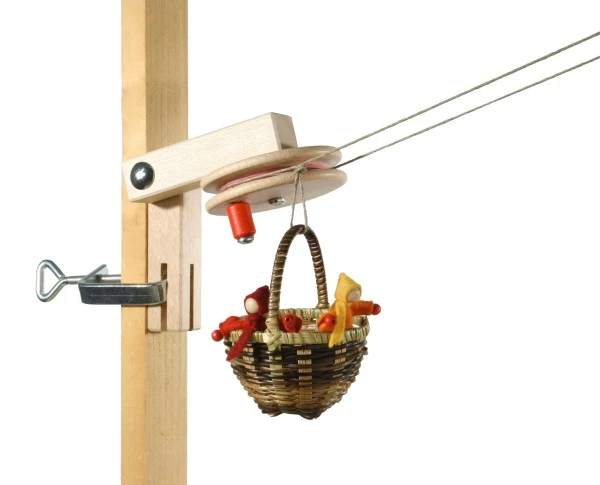 Die KÖRBCHEN-SEILBAHN besteht aus zwei Stationen, um die das Seil wie bei einem Sessellift rundum läuft. Die Stationen werden mit den beiden beiliegenden Zwingen an Tischkanten, Regalen oder Ähnlichem befestigt. Die geflochtenen Körbchen hängen fest am Seil und können von den Stationen aus durch Kurbeln bewegt werden.