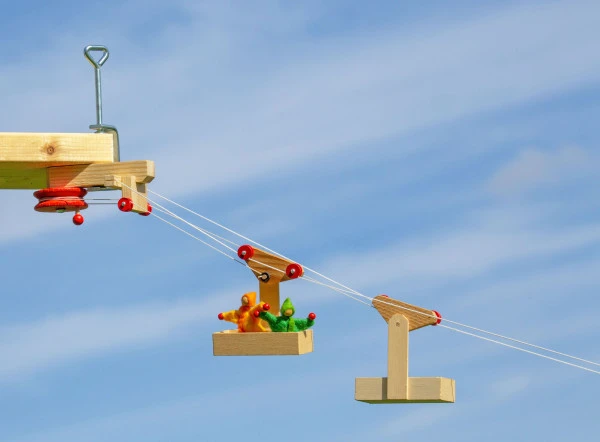 Seilbahn für kleine Püppchen und Lasten von der Firma Kraul.2 Wagen und Station für den Pendelverkehr. Bausatz mit Zwingen und 2x5m Schnur, Gondeln je 9cm.