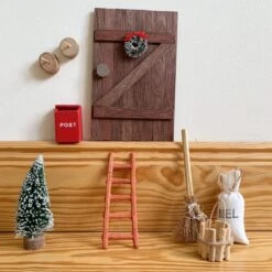 Dieses Wichteltürset verbreitet gleich gemütliche Atmosphäre, die braune Holztür und die süßen Accessoires sehen wunderbar klassisch aus. Rote Akzente passen zu Weihnachten, sogar ein Tannenbaum ist dabei!