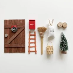 • Das Bastelset besteht aus 9 Teilen: 1 Wichteltür, 1 Leiter, 1 Tannenbaum 1 Besen, 1 Mehlsack, 1 Korb, 1 Briefkasten und 2 Haken